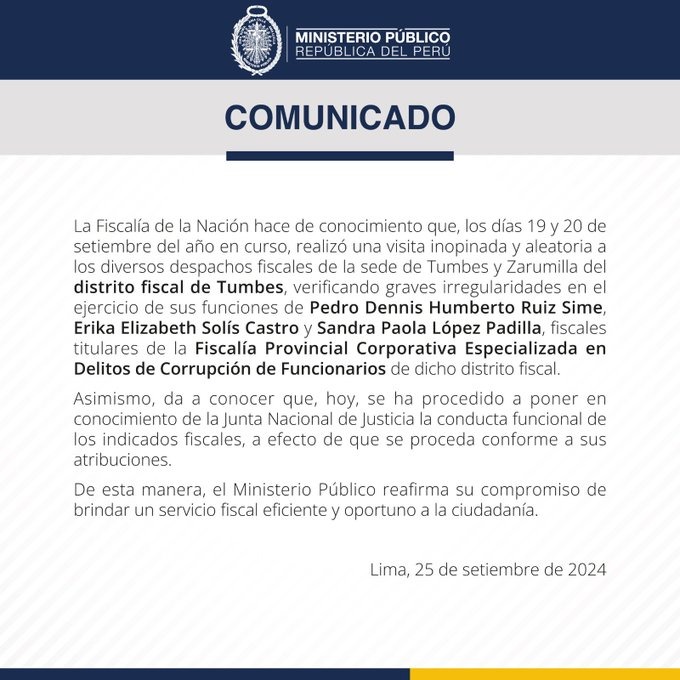 La Junta Nacional de Justicia investigará a Pedro Dennis Humberto Ruiz Sime y Ericka Elizabeth Solía Castro y Sandra Paola López Padilla, fiscales titulares de la Fiscalía Provincial Corporativa Especializa en Delitos de Corrupción de Funcionarios por presunta inconducta funcional. Esto tras una visita inopinada y aleatoria de la Fiscalía de la Nación el pasado 19 y 20 de setiembre del 2024 a la sede de Tumbes y Zarumilla del distrito fiscal de Tumbes.