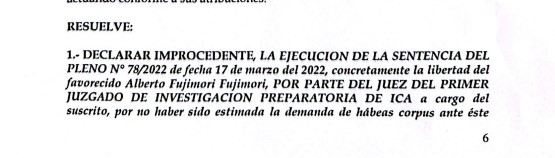 #LOÚLTIMO Primer Juzgado de Investigación Preparatoria de Ica declara improcedene la ejecución de la sentencia N° 78-2022, de fecha 17 de marzo del 2022, concretamente la libertad de Alberto Fujimori, por parte de su despacho por no haber sido estimada la demanda de habeas corpus pic.twitter.com/9U64AxfLKh