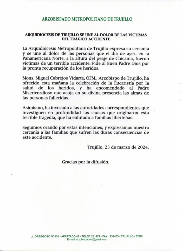 La Arquidiócesis Metropolitana de Trujillo se une al dolor de las víctimas del trágico accidente en la Panamericana Norte, cerca del peaje de Chicama, expresando su solidaridad y pidiendo por la pronta recuperación de los heridos. Mons. Miguel Cabrejos Vidarte, arzobispo de Trujillo, lideró una misa esta mañana por la salud de los afectados y encomendó las almas de los fallecidos.