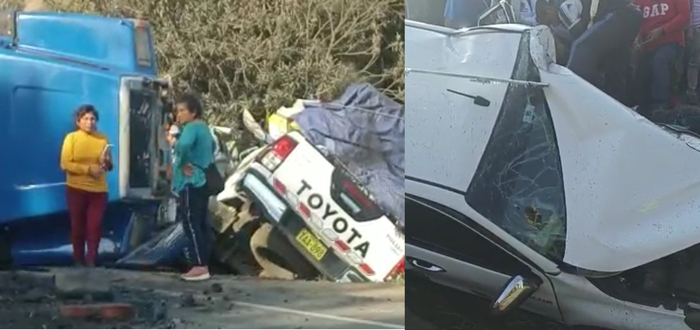 Una camioneta pequeña chocó con un volquete que transportaba carbón, a la altura del sector Cerro Blanco, en la carretera a Otuzco. El chofer del volquete carbonero se habría dirigido en sentido contrario ocasionando un choque violento, según afirman los testigos.