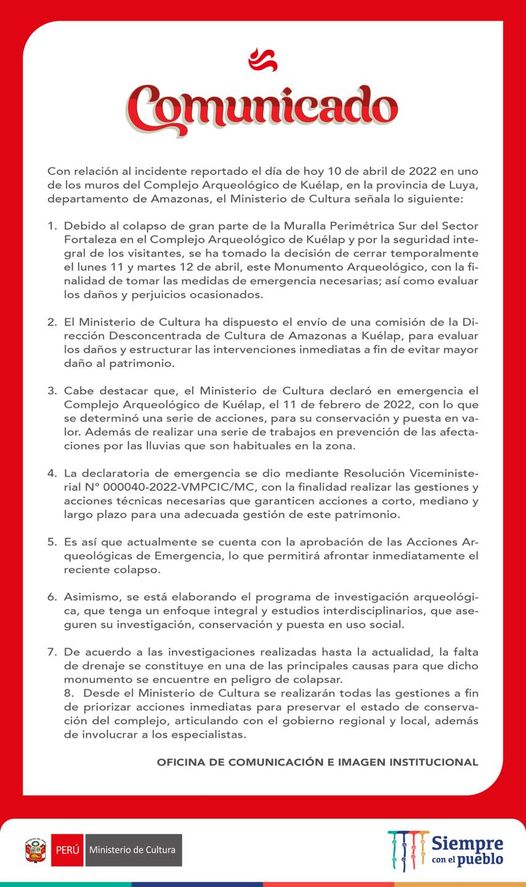 Junto a esto, el Mincul recordó que el Complejo Arqueológico de Kuélap fue declarado en emergencia el 11 de febrero de este año, con lo que se determinó una serie de acciones para su conservación y puesta en valor. Además de llevar a cabo una serie de trabajos de prevención frente a las lluvias, que son habituales en la zona.