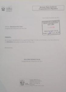 El Congresista de la República, Guillermo Bermejo, presentó su renuncia irrevocable a la bancada de Perú Libre.