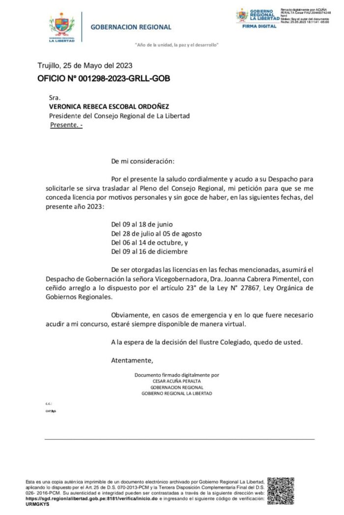 Luego de que el gobernador regional César Acuña, solicitara licencia para ausentarse por motivos personales y sin goce de haber en determinadas fechas, el Consejo Regional de La Libertad, sometió a votación la decisión, teniendo como resultado la APROBACIÓN de la solicitud de licencia.
