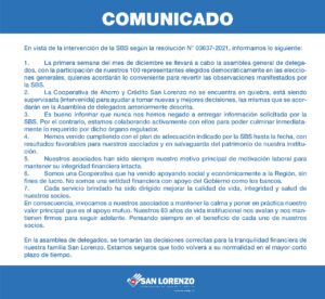 La Cooperativa San Lorenzo se pronunció tras la intervención de la Superintendencia de Banca, Seguros y AFP (SBS) a sus instalaciones realizada este último martes en Trujillo.