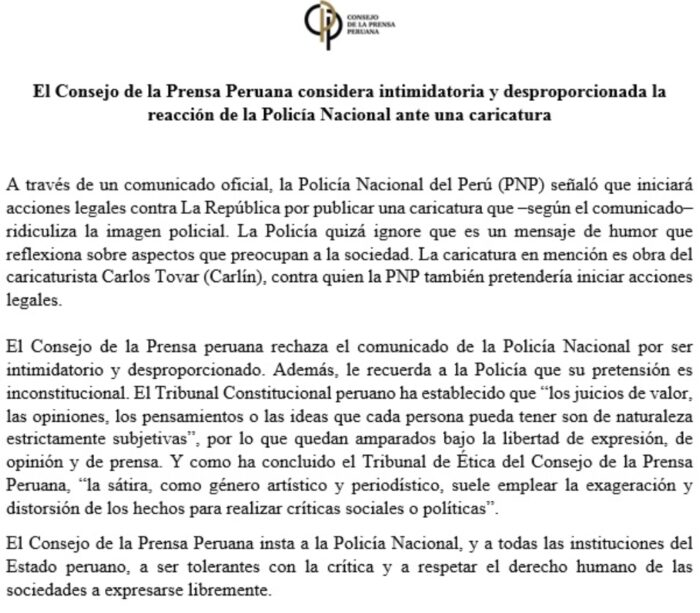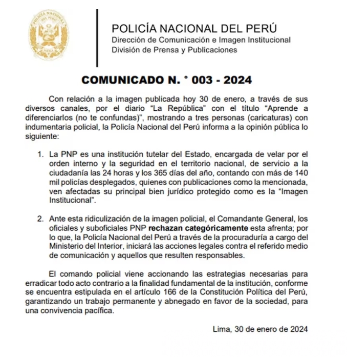 La Policía Nacional del Perú (PNP) señaló el inicio de acciones legales contra el diario La República y el caricaturista Carlos Tovar “Carlín” por publicar una caricatura que, según el comunicado oficial de la PNP, ridiculiza la imagen policial.
