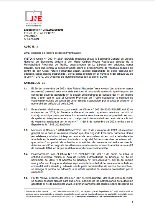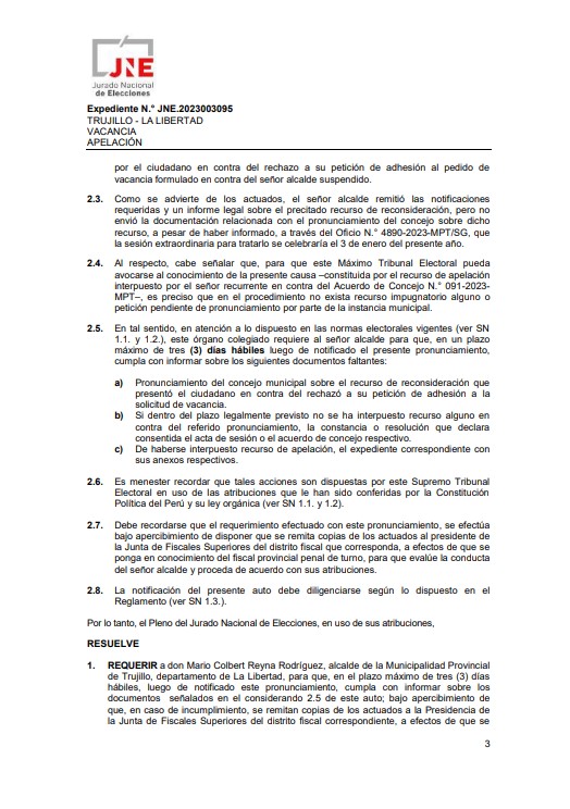 Mediante la Secretaría General del Jurado Nacional de Elecciones, se ha solicitado al alcalde de Trujillo, Mario Reyna, remitir la documentación sobre el procedimiento de vacancia seguido contra el suspendido alcalde, Arturo Fernández, en los próximos 3 días.