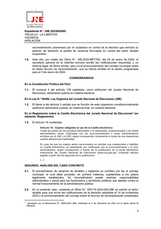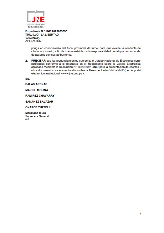El pasado 10 de enero del 2024, el presidente del Jurado Nacional de Elecciones, Jorge Salas Arenas, en su sustento del voto por la suspensión de Arturo Fernández como alcalde de Trujillo, recomendó la evaluación del proceso de vacancia. Consideró que, al existir una sentencia en segunda instancia, en el marco normativo del Código Procesal Penal del 2004, que implica una condena firme, señaló que el proceso penal de la persona ya habría concluido.