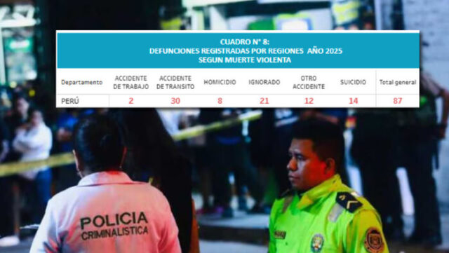 En lo que va de febrero de 2025, se han registrado 87 muertes violentas en Perú. De las cuales, ocho fueron homicidios, según datos del Sistema Informático Nacional de Defunciones (SINADEF).