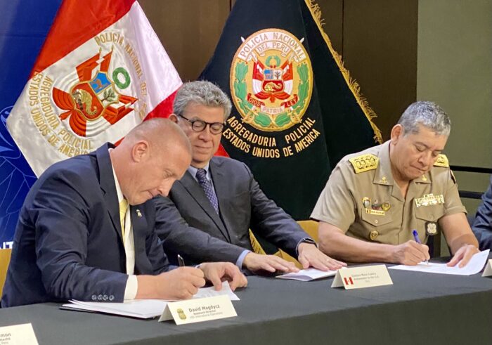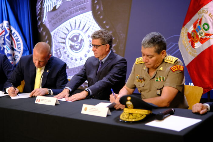 El memorando de cooperación fue firmado por David Magdycz, Subdirector de Operaciones Internacionales de HSI, y Jorge Angulo, Comandante General de la Policía Nacional del Perú, el pasado 15 de septiembre. Gustavo Meza Cuadra, Embajador de Perú en los Estados Unidos, también estuvo presente en la ceremonia de firma.