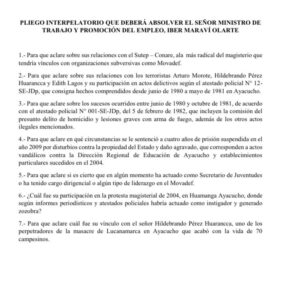 La bancada de Renovación Popular, con el apoyo de Fuerza Popular y Avanza País, presentaron una moción de interpelación contra el ministro de Trabajo, Iber Maraví, pidiendo que aclare sus presuntos vínculos con el terrorismo. Específicamente, piden que el ministro Maraví explique su relación con el Sutep – Conare.