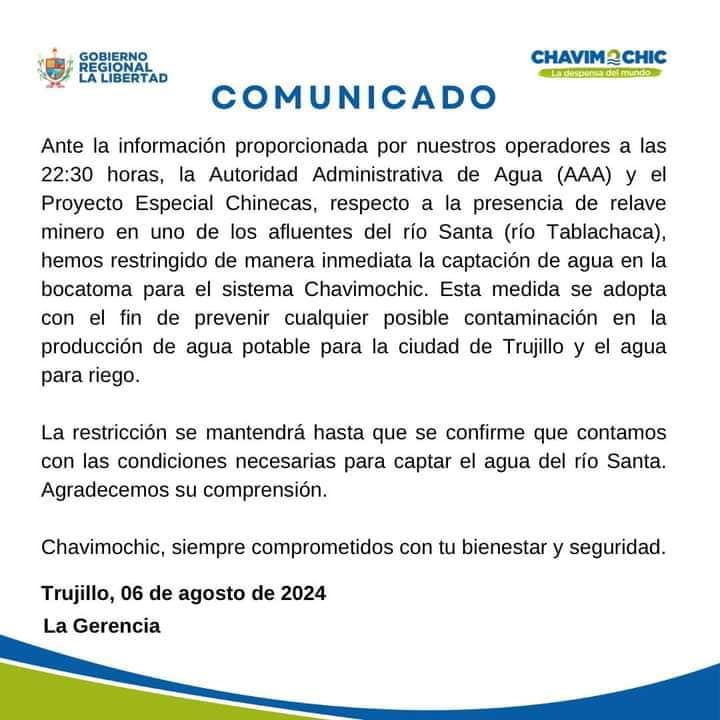 Chavimochic afirmó que esta medida será efectiva hasta que se confirme que “contamos con las condiciones necesarias para captar el agua del río Santa”, por lo que no hay un plazo definido en el que se pueda asegurar con certeza que el agua potable se restituirá en las próximas horas o días.