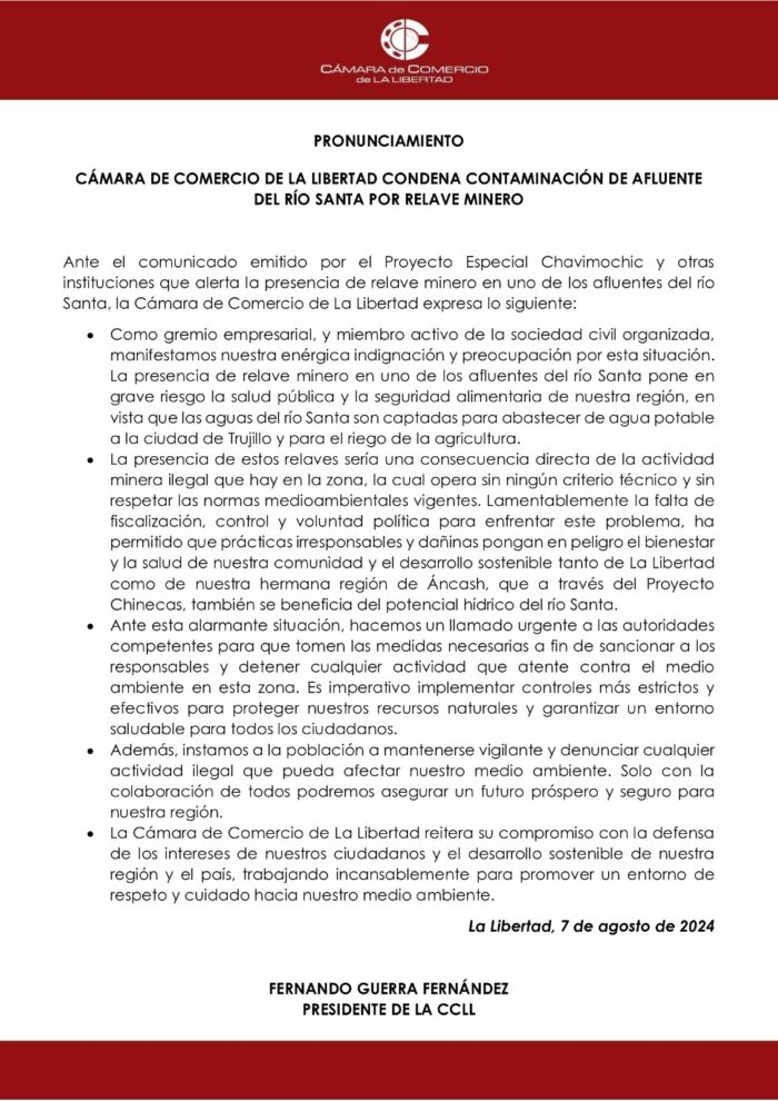 CÁMARA DE COMERCIO DE LA LIBERTAD CONDENA CONTAMINACIÓN DE AFLUENTE DEL RÍO SANTA POR RELAVE MINERO