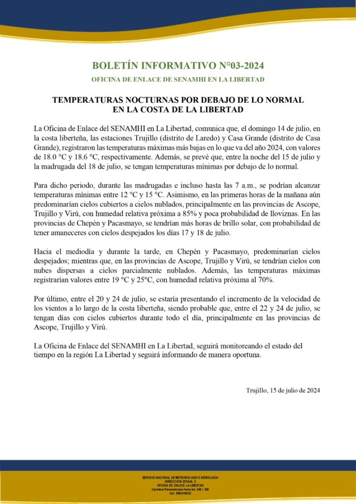 El pasado domingo 14 de julio marcó un récord de bajas temperaturas máximas en la provincia de Trujillo y distrito de Casa Grande, alcanzando mínimos de 18.0 °C y 18.6 °C respectivamente, los más bajos del año 2024 hasta la fecha.