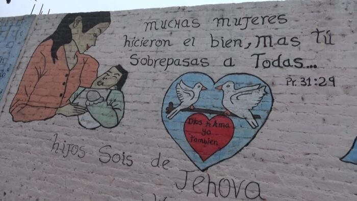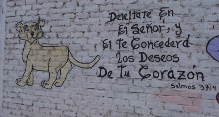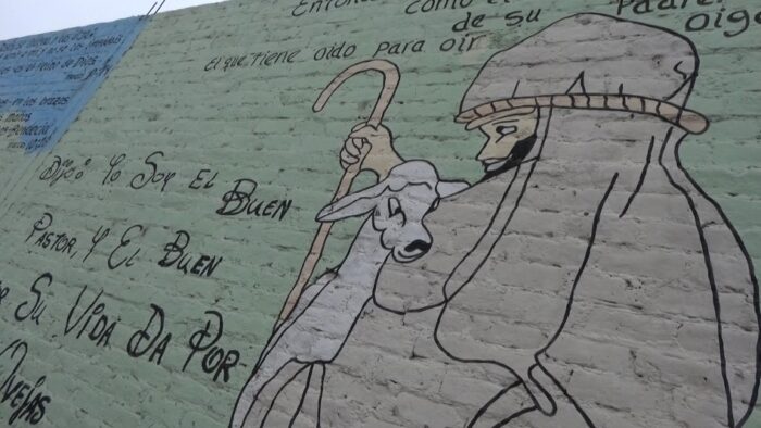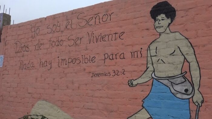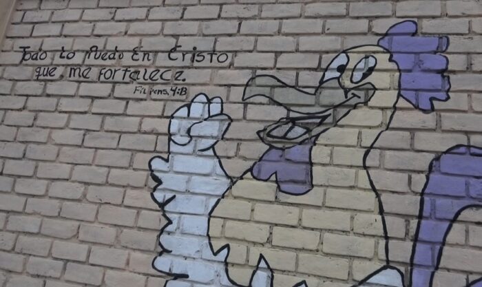El artista urbano Nicolás Caipo pinta murales en los exteriores del colegio “Francisco Bolognesi” con frases motivadoras y mensaje alusivos a versículos bíblicos.