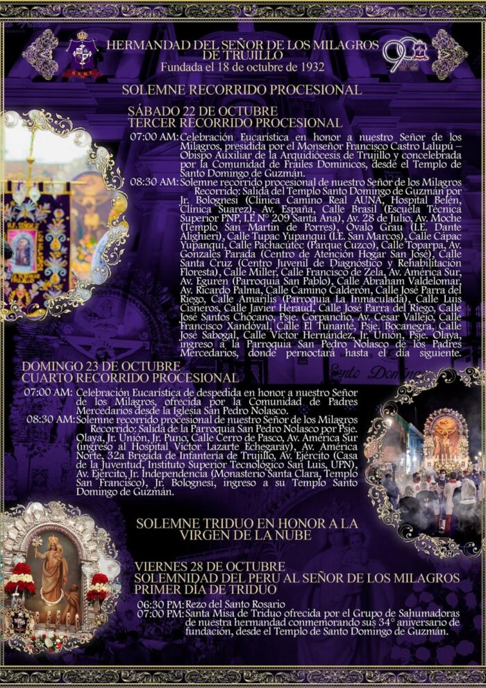 Inicio Noticias La Libertad Trujillo: cronograma de las celebraciones del Señor de los Milagros en Trujillo NoticiasLa LibertadTrujillo Trujillo: cronograma de las celebraciones del Señor de los Milagros en Trujillo octubre 19, 2022 Conoce las diferentes actividades de esta semana programadas por la Hermandad del Señor de los Milagros de Trujillo. Desde hoy, 19 de octubre al 21 de octubre se realizarán rezos a las 6:30 p.m. seguida de la santa misa a las 7:00 p.m.