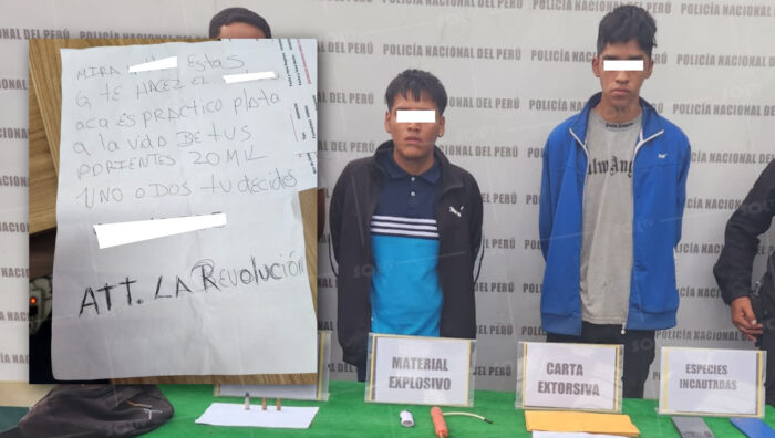 Con una carta extorsiva y una dinamita sorprenden a dos jóvenes de 18 y 20 años acusados de extorsionar a comerciantes del AA.HH Wichanzao en el distrito La Esperanza, Trujillo, reportó la Policía Nacional.