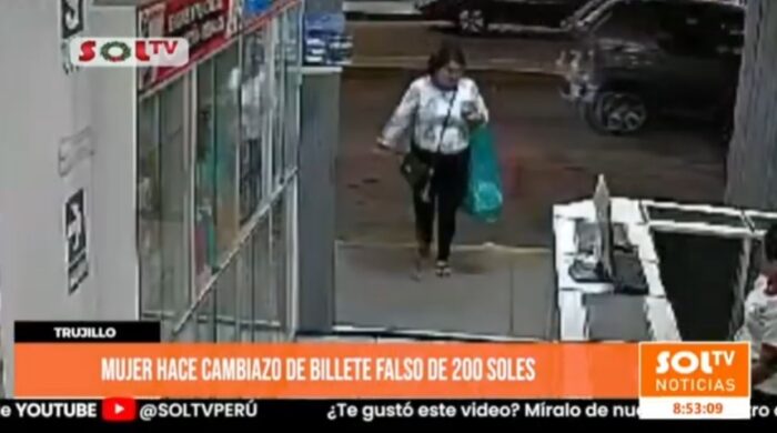 Mujer realiza cambiazo de un billete falso de 200 soles en una botica del distrito El Porvenir. Los movimientos y estrategia de la fémina quedaron grabadas por las cámaras de seguridad.