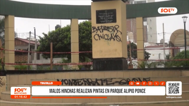 En medio de las celebraciones por Fiestas Patrias, un hecho generó indignación ya que el parque Alipio Ponce, ubicado en la urbanización El Recreo, amaneció con diversas pintas realizadas por supuestos hinchas que aprovecharon la poca vigilancia durante el feriado. Este acto de vandalismo causó rechazo en la comunidad.