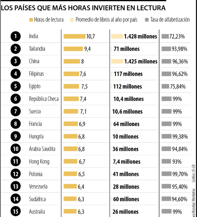 Según el ranking de World Atlas, Venezuela es el país de Sudamérica con la mayor actividad lectora, ocupando el puesto 13 de la lista, con una dedicación diaria de más de seis horas a la lectura. Además, su tasa de alfabetización supera el 95%. Asimismo, lideran las naciones de Asia como la India, Tailandia, China y Filipinas.